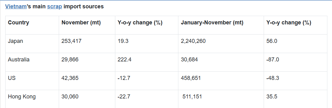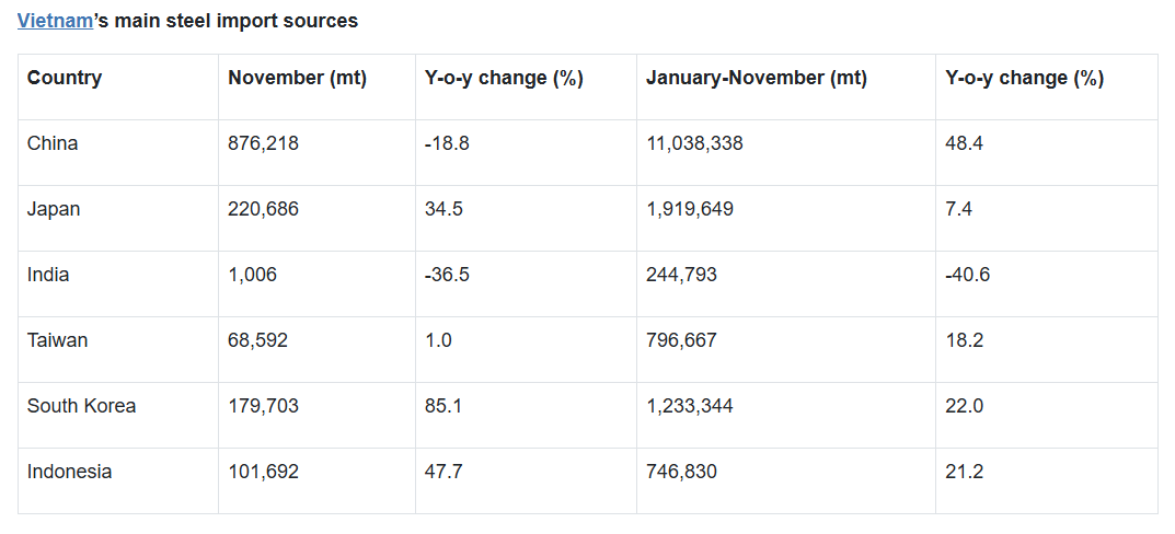 In the first 11 months of the year, Vietnam's steel imports increased by 32.9 percent year on year to 16.16 million mt, while